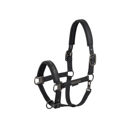 Kantar z wytrzymałej taśmy obszytej skóropodobnym materiałem, ozdobiony logo kolekcji na ganaszach i nachrapniku. Dodatkowo nachrapnik wyłożony rzędem kryształków. Miękko podszyty. Kantar regulowany obustronnie w potylicy oraz w części nachrapnikowej. W zestawie z breloczkiem. Okucia w ciemnym kolorze.