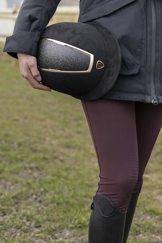 Kask GLINT MOIRE firmy EQUITHEME, wykonany z tworzywa ABS, bardzo odpornego na uderzenia, nawet w ekstremalnych temperaturach. Elegancki, wykończony alkantarą i przyozdobiony mieniącą się aplikacją pośrodku skorupy. Ramka w kolorze różowego złota.