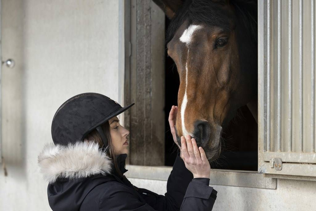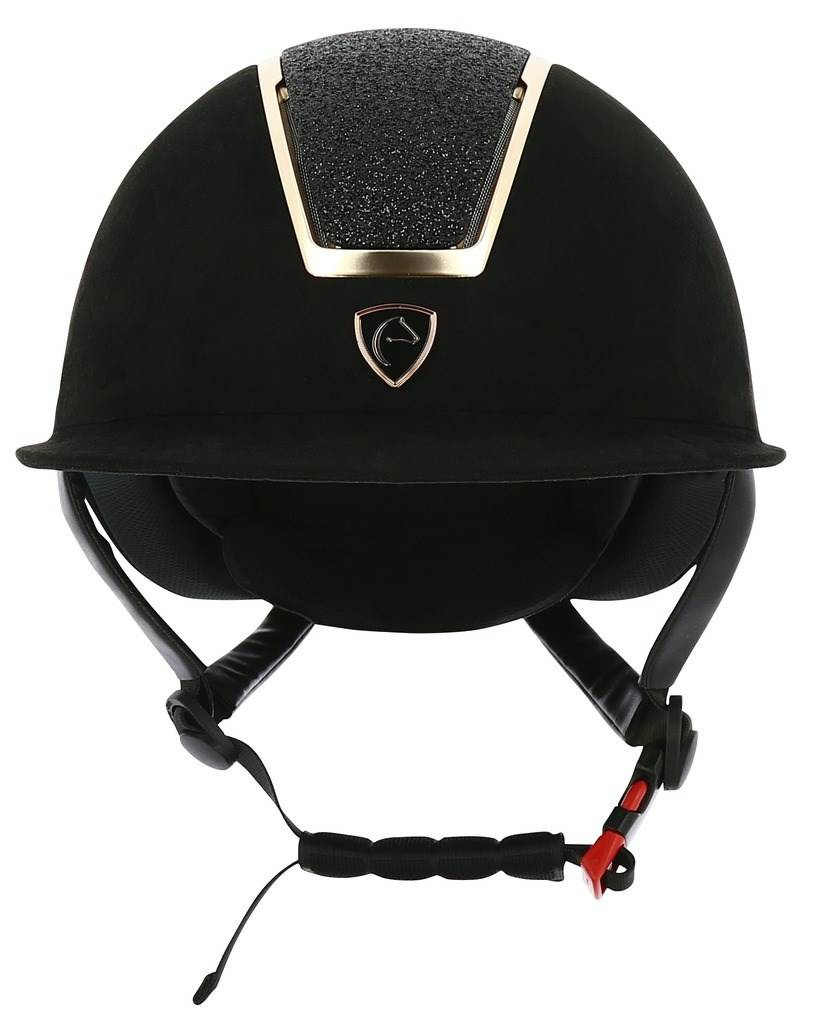 Kask GLINT MOIRE firmy EQUITHEME, wykonany z tworzywa ABS, bardzo odpornego na uderzenia, nawet w ekstremalnych temperaturach. Elegancki, wykończony alkantarą i przyozdobiony mieniącą się aplikacją pośrodku skorupy. Ramka w kolorze różowego złota.