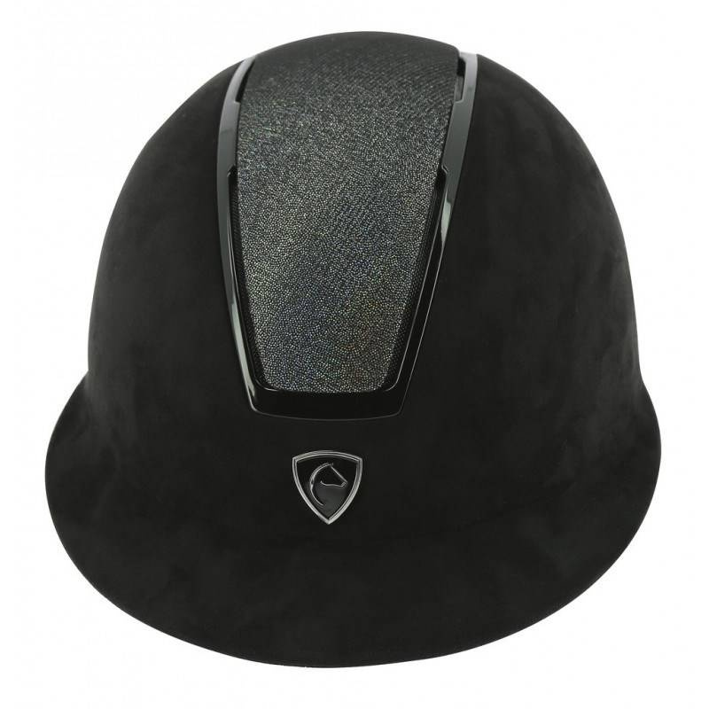 Kask GLINT MOIRE firmy EQUITHEME, wykonany z tworzywa ABS, bardzo odpornego na uderzenia, nawet w ekstremalnych temperaturach. Elegancki, wykończony alkantarą i przyozdobiony mieniącą się aplikacją pośrodku skorupy.