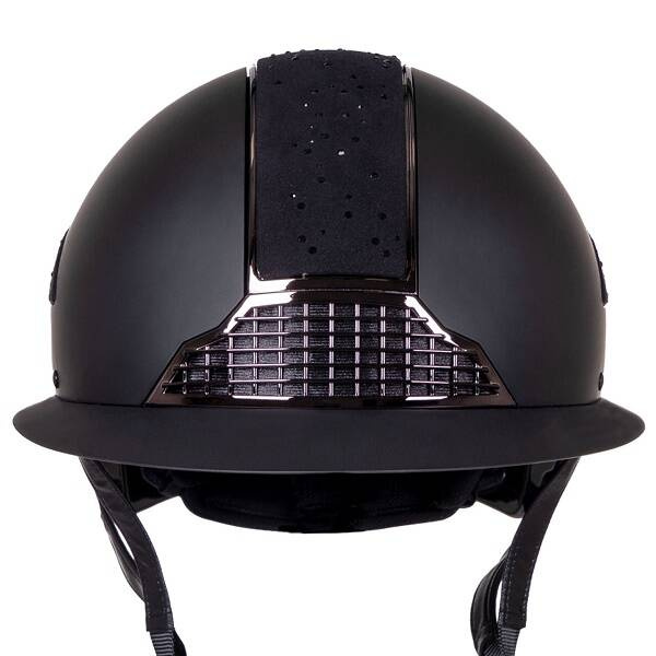 Efektowny kask jeździecki z matową powłoką zewnętrzną oraz aplikacją z