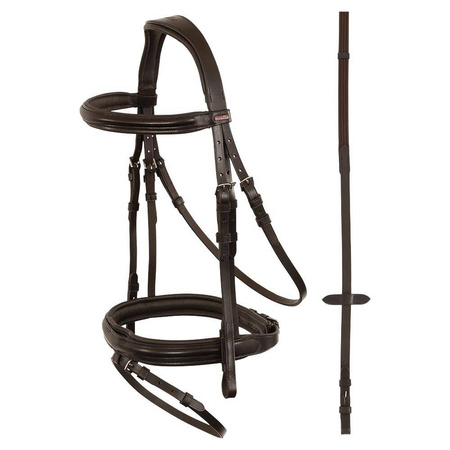Ogłowie Bondy marki Premiere wykoanne z wysokiej jakości, miękkiej skóry. Klasyczny, prosty naczółek. Pasek potyliczny, oraz nachrapnik wyściełane miękką skórą. Podgardle i nachrapnik wypinane z obu stron. Możliwość całkowitego wypięcia skośnika. Sprzedawane w komplecie z wodzami parcianymi, zapinanymi na haczyki. Okucia w kolorze srebrnym ze stali nierdzewnej.